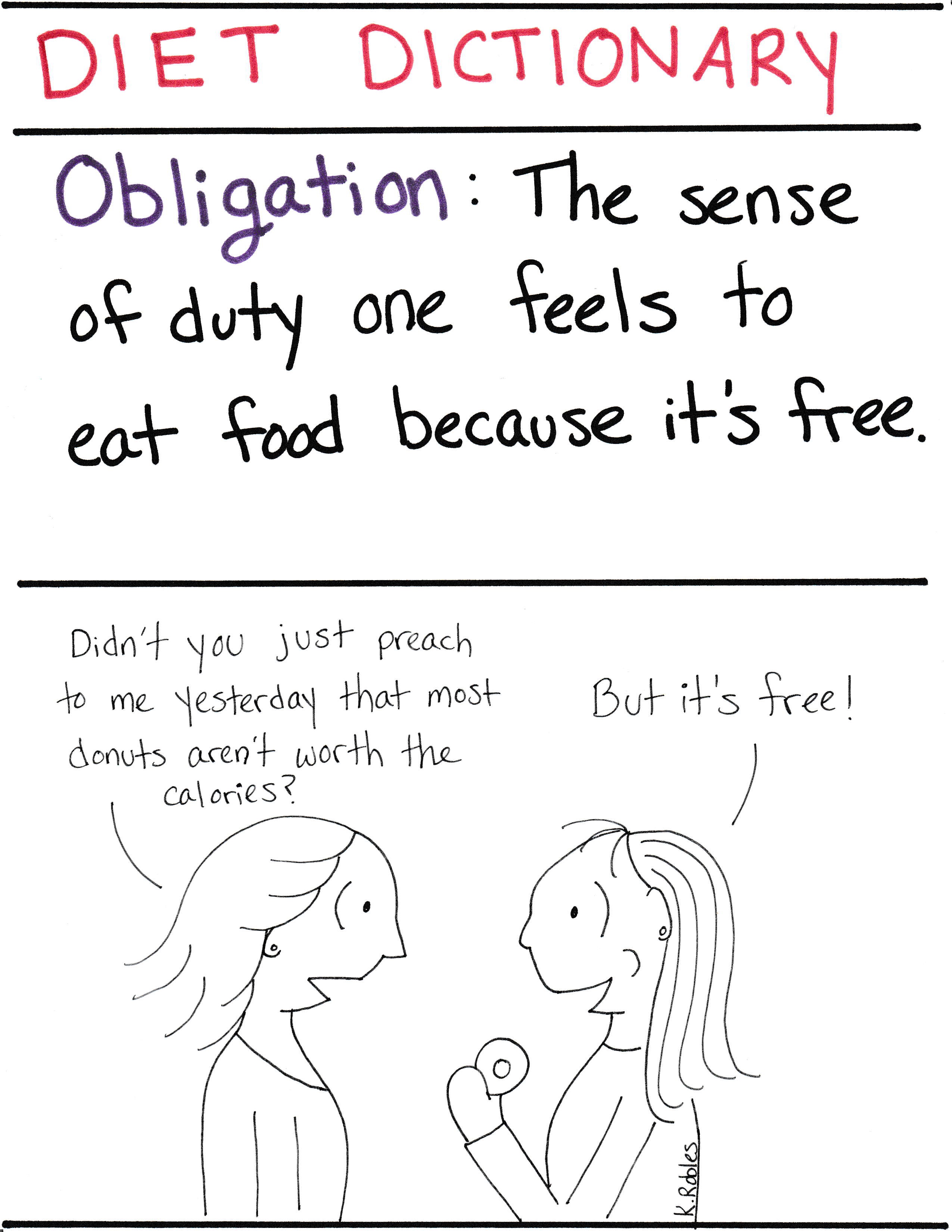 20Dec. ’15 Diet Dictionary: Obligation Share this: Click to share on Facebook (Opens in new window) Facebook Click to share on Pinterest (Opens in new window) Pinterest Like Loading... Related Posted by Katie Robles. Categories: Cartoons. Tags: diet cartoon, Diet Dictionary, free food, funny food. 1 Comment