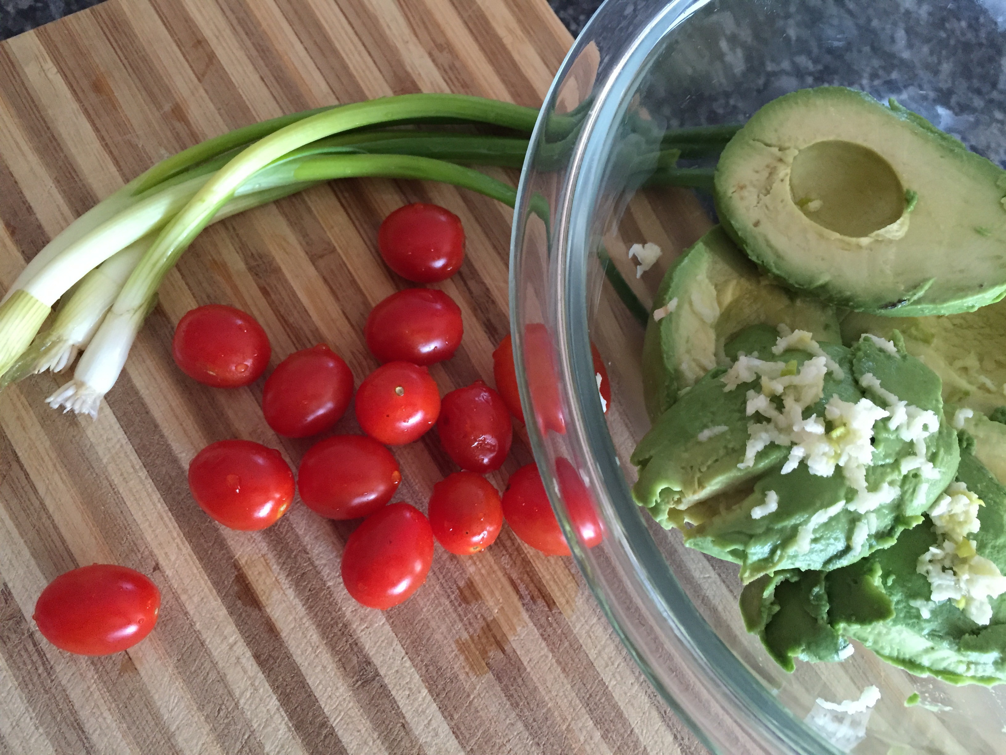 Chop the scallions, tomato, and cilantro. Mince the garlic. Mix all ingredients. Scoop and enjoy!