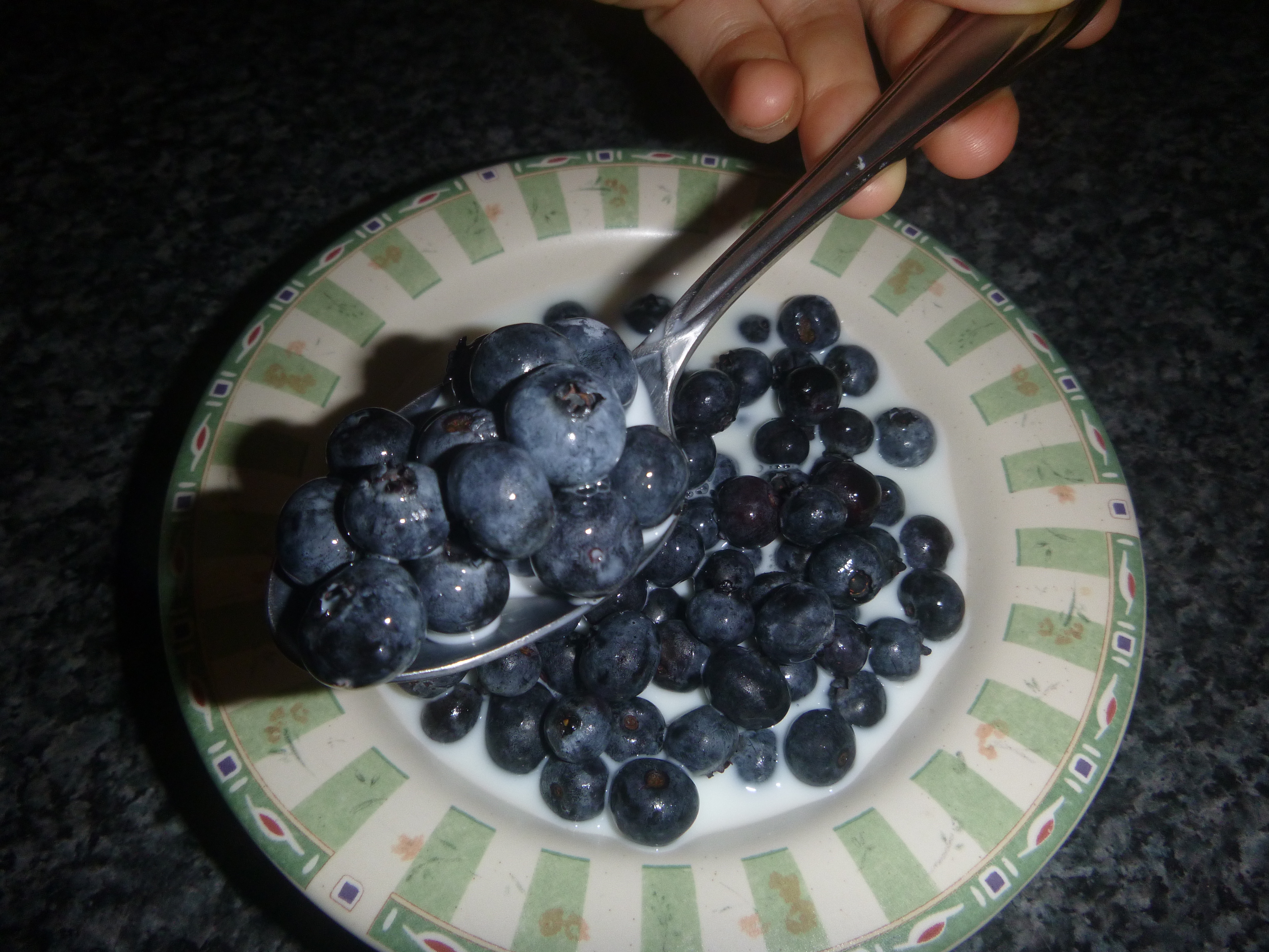 1. Fill bowl with blueberries. (Sometimes I add some Cheerios.)